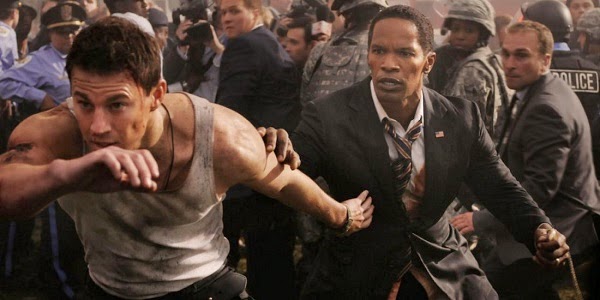 All right, fine. Channing Tatum wants to be a Secret Service agent to impress his disaffected-yet-politically-interested daughter. The two of them go to the White House for his interview, conducted by a high school acquaintance of his (Maggie Gyllenhaal). Though they're excited to bump into the President (Jamie Foxx, playing an Obama knockoff to the hilt), the interview doesn't go well. It is at this moment that the head of Secret Service (James Woods) stages a coup, along with some generic terrorists. Tatum and Foxx fight back a la Die Hard, the kid is somewhat obnoxiously precocious, puns and other tortured wordplay are slung around with wild abandon, there's a final twist... You know the drill.
